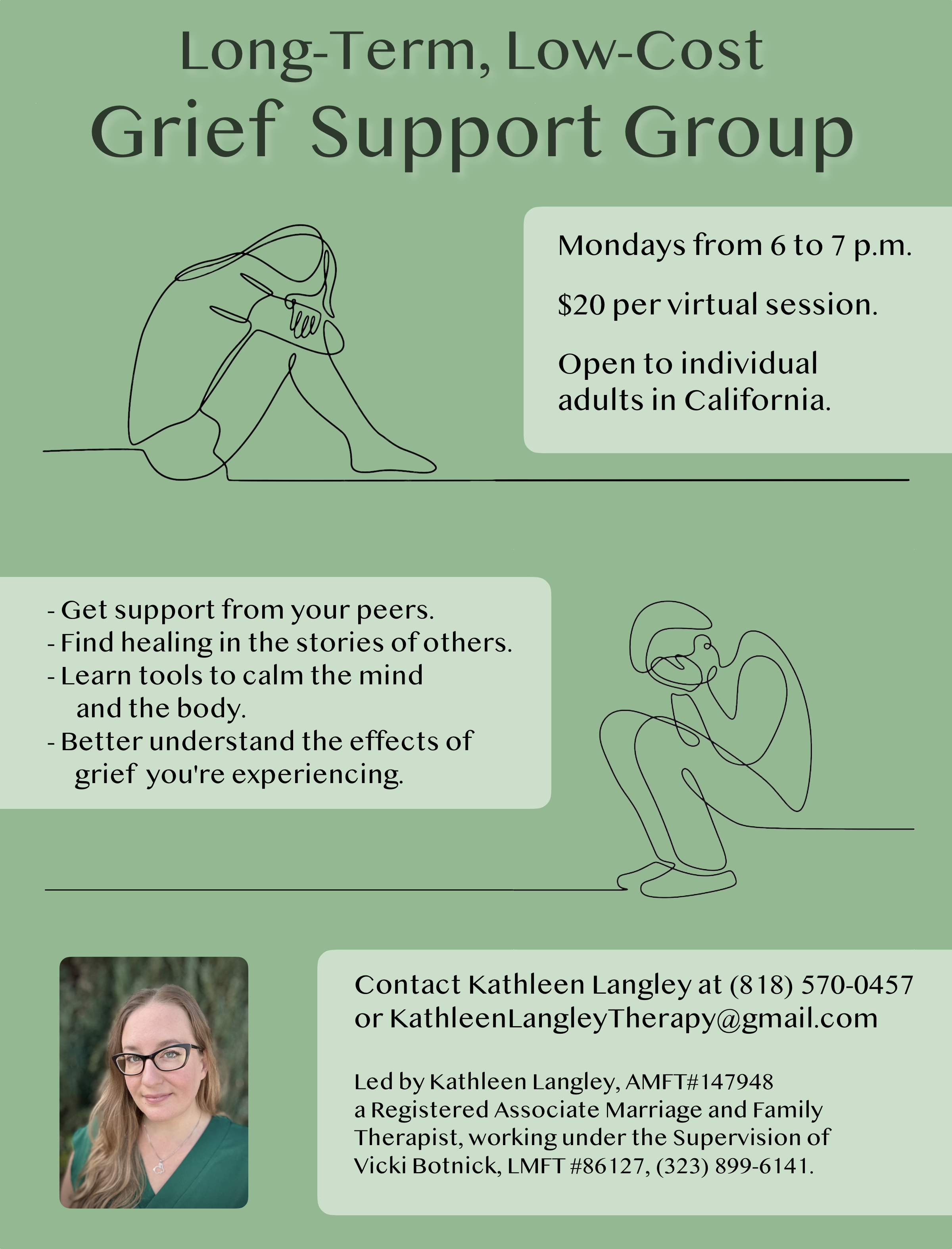 I also run a long-term, low-cost grief group. We meet weekly online, and the group is primarily made up of women in their 20’s and 30’s who have lost a loved one, though all are welcome. The group is long term in order to help get you through the most difficult times, especially the “year of firsts.” Grief wants and needs to be seen and heard by others, and this supportive space allows you to connect with others and work through your grief. Please reach out if you are interested in the group.
